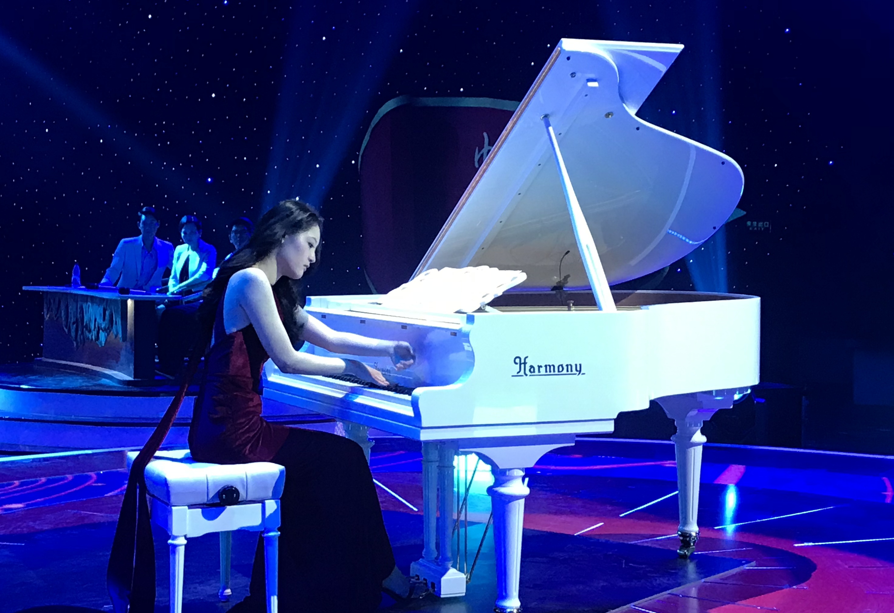 晚会现场节目精彩纷呈,引起观众的阵阵掌声。哈曼尼钢琴作为晚会独家指定用琴大放异彩,其中的钢琴独奏表演,更是将晚会的氛围推向高潮。青年女钢琴家用哈曼尼钢琴现场弹奏,精湛的弹奏技巧配上哈曼尼钢琴完美的音质,让听众们沐浴在美妙的音乐海洋里。
